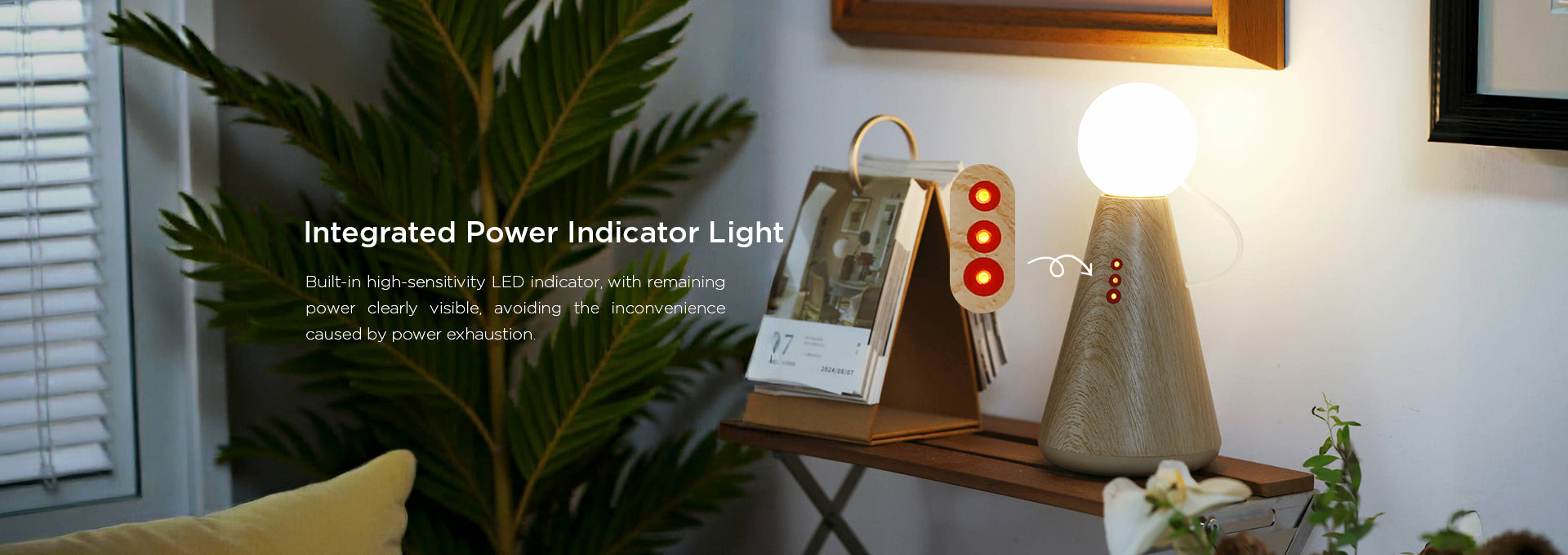 Button-shaped dots display the battery level, while its elegant form combines refined texture with a soft, tactile feel—making it a stylish decoration even when unlit.