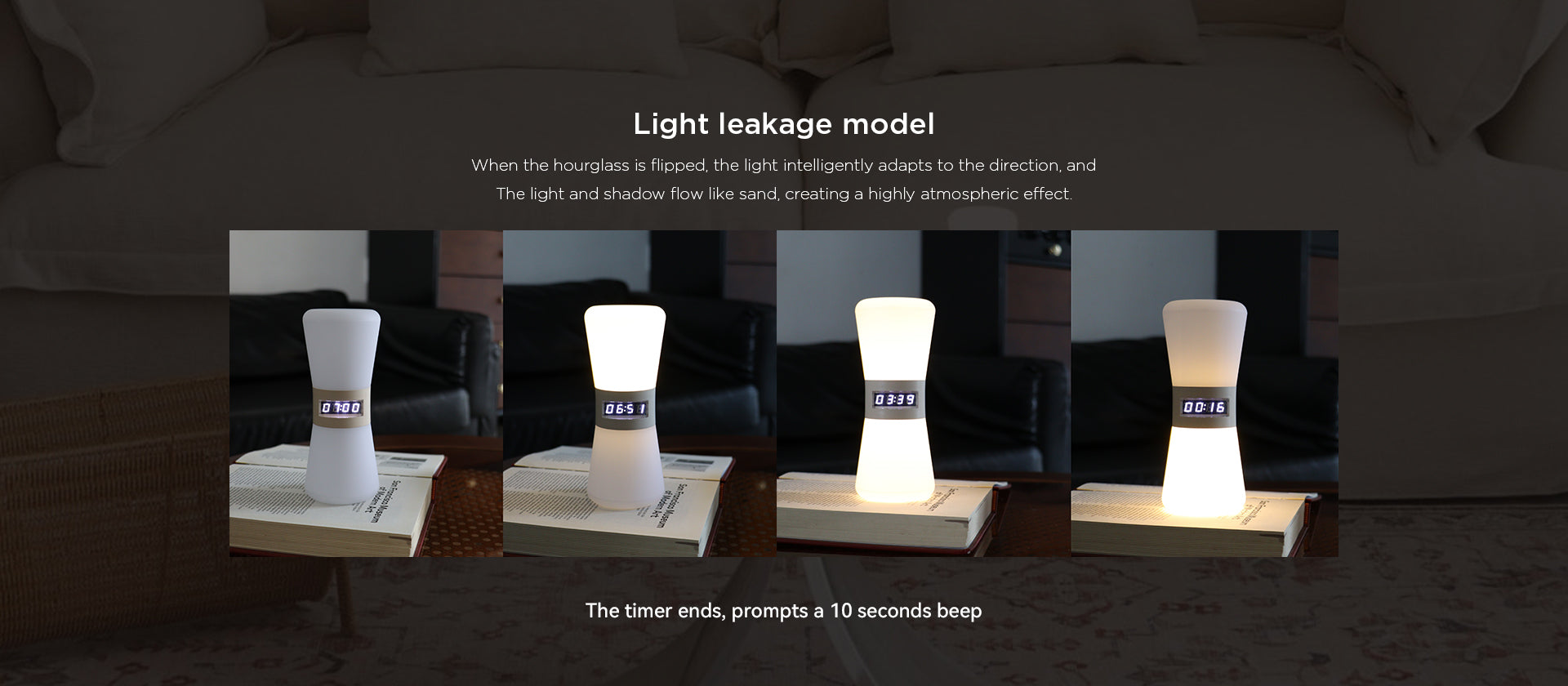 Signature light leak effect that intelligently adapts to the direction of the light when tipping the hourglass. The light and shadow flow like sand, creating a strong sense of atmosphere. A 10-second buzzer will sound as a reminder when the countdown ends.