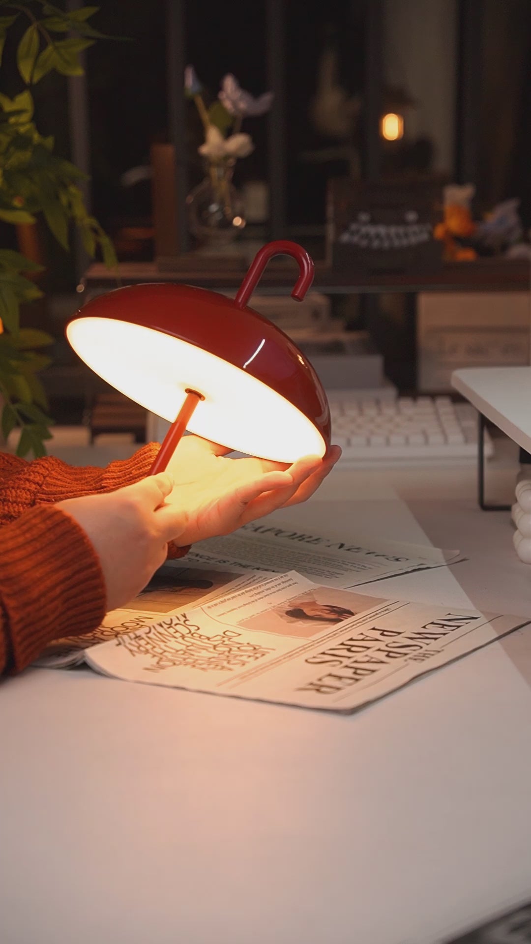 The umbrella-shaped lamp offers versatile placement options—it can be hung, set on a table, or placed on the floor.